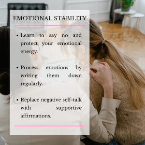Boundaries protect your time and energy, allowing you to prioritize what matters most. Saying no when necessary reduces feelings of overwhelm and strengthens your self-respect, which enhances emotional stability. - Journal Your Feelings: